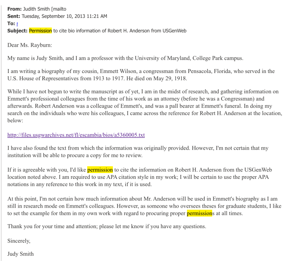 I have to say that about 98 percent of the time I’ve asked permission to use someone’s source, it was granted without any concerns; some institutions require a release or similar credit in the final version of my research, which is completely acceptable, and that’s the end of the exchange.