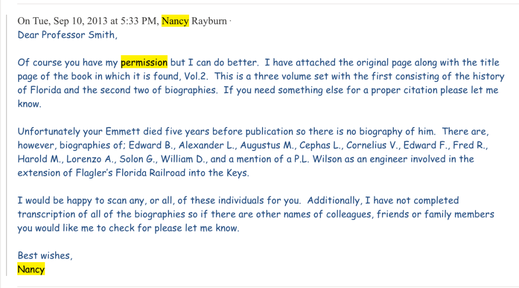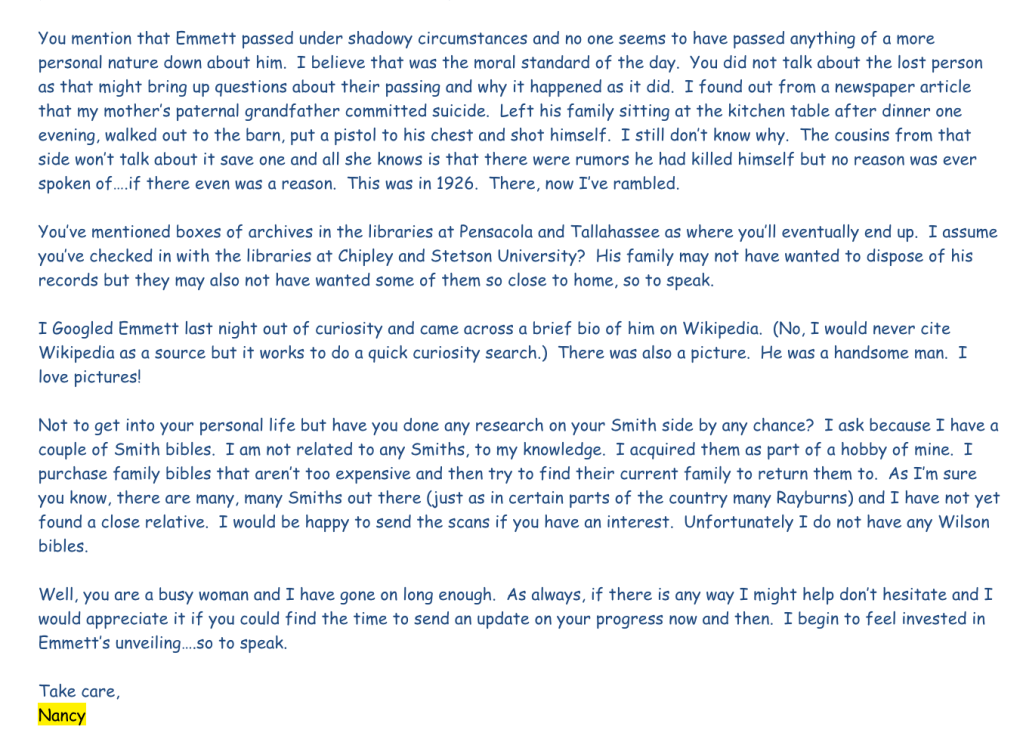 And so began a string of constant, regular email messages, in which Nancy and I discussed research, prominent Floridians from the 1900s, contacts and the like. It was wonderful — and here’s the thing I found really amazing: She’s interested in Emmett and his story, and she’s asking questions that really make me think deeply about this distant cousin of mine.