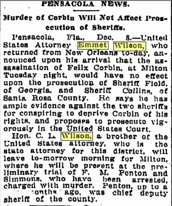 Emmett likely knew of Frank Penton already (Penton served the sheriff’s department in Santa Rosa County), but his first encounter as prosecutor came in late 1910 — as reported in the New Orleans Times-Picayune — Felix Corbin was assassinated in Milton on December 6, and Frank Penton was involved.