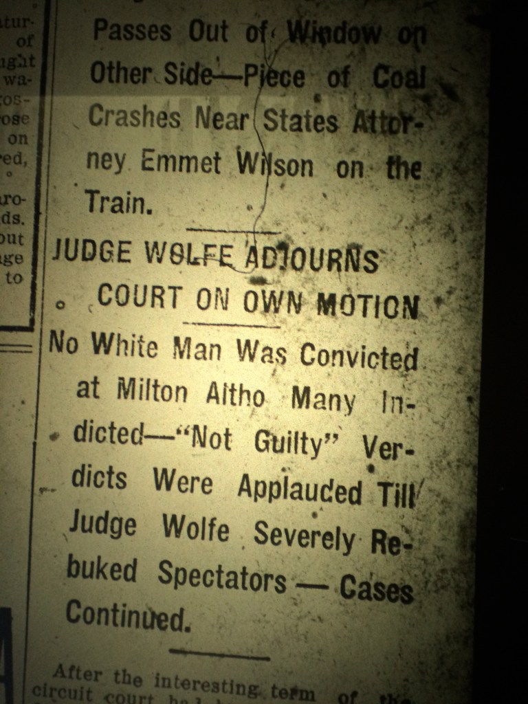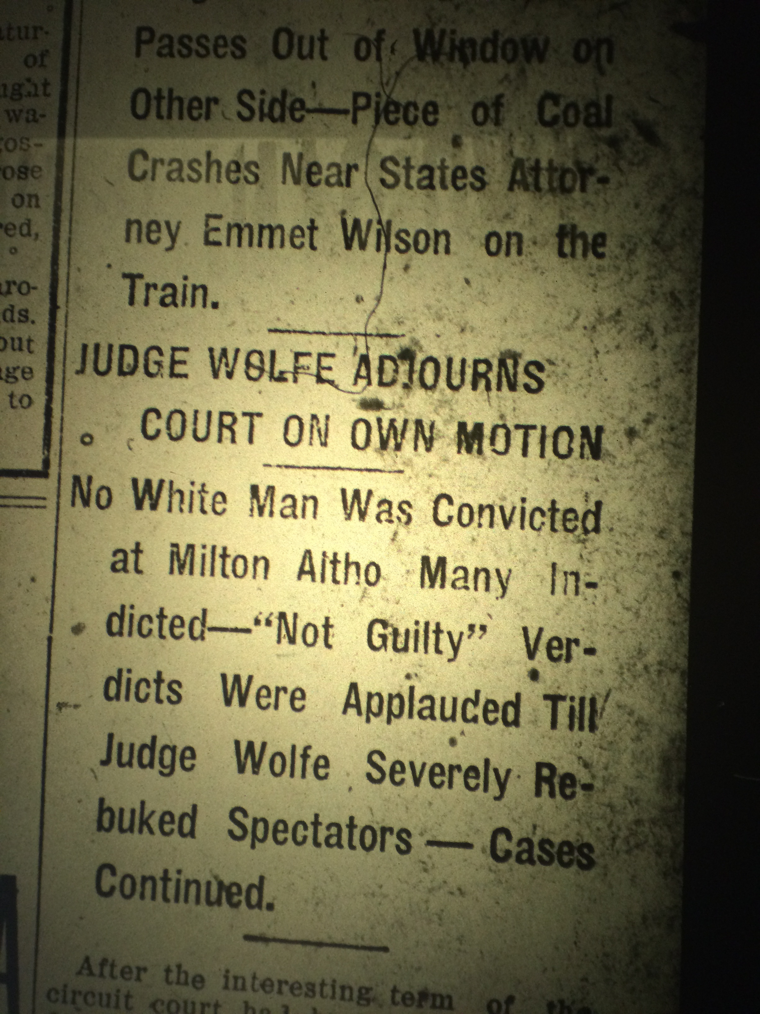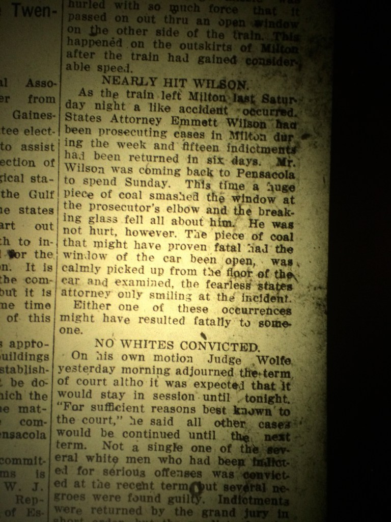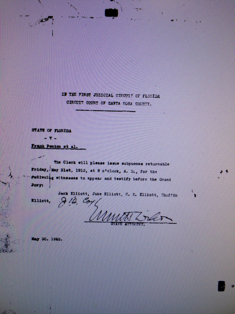 Background on the Corbin case from an article dated June 5, 1910 from The Pensacola Journal (page 1) includes the language from the affidavit. You can read the entire article here, from the Library of Congress. At a preliminary trial on December 9, 1910, Penton was initially acquitted of the murder charge in a preliminary trial held in Santa Rosa county (interestingly, this trial was prosecuted by Emmett’s older brother, Cephas Wilson, also a state attorney). However, Penton was not free for long; another article, from the December 23, 1910 issue of The Pensacola Journal (page 1), reported federal charges for the murder of Corbin. He was indicted by a grand jury for the murder of the federal witness (Corbin).