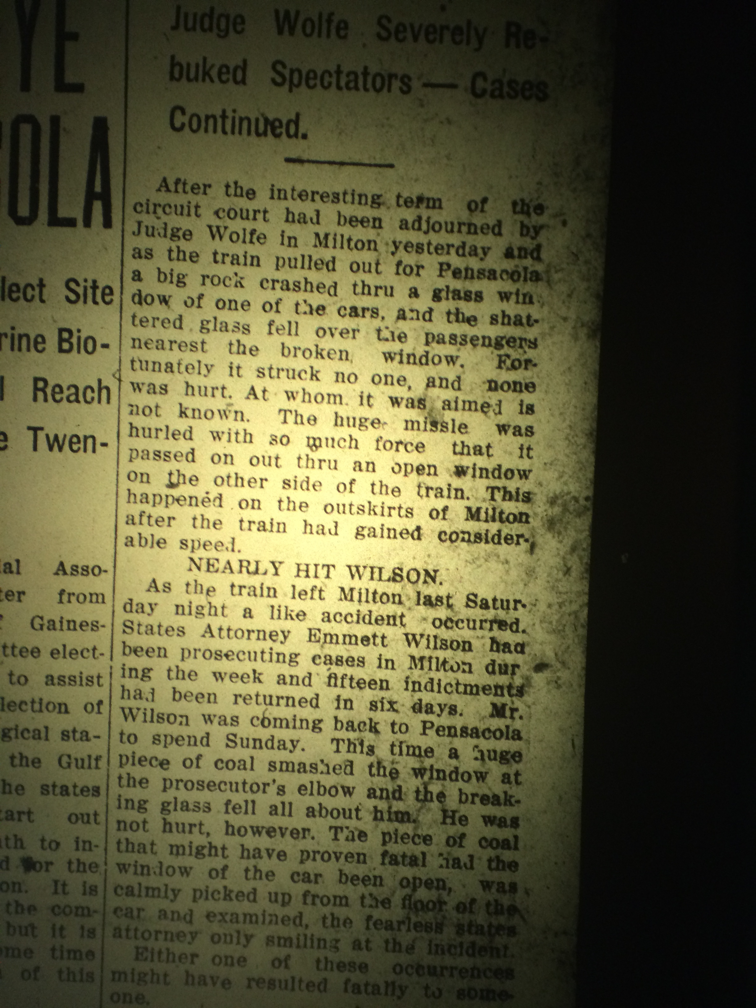 Note that The Pensacola Evening News portrayed Emmett as ‘fearless’, picking up the piece of coal that was thrown at the window where he sat and smiling at it (the window shattered across his arm; he wasn’t hurt) as the train pulled out of Milton. We don’t know if he stuck around in the passenger car; knowing that Emmett was (at this point) fully alcoholic, I would guess he spent the rest of the trip in the bar car (if there was one), or, quietly quaffing from his flask, which he discretely carried in a briefcase.