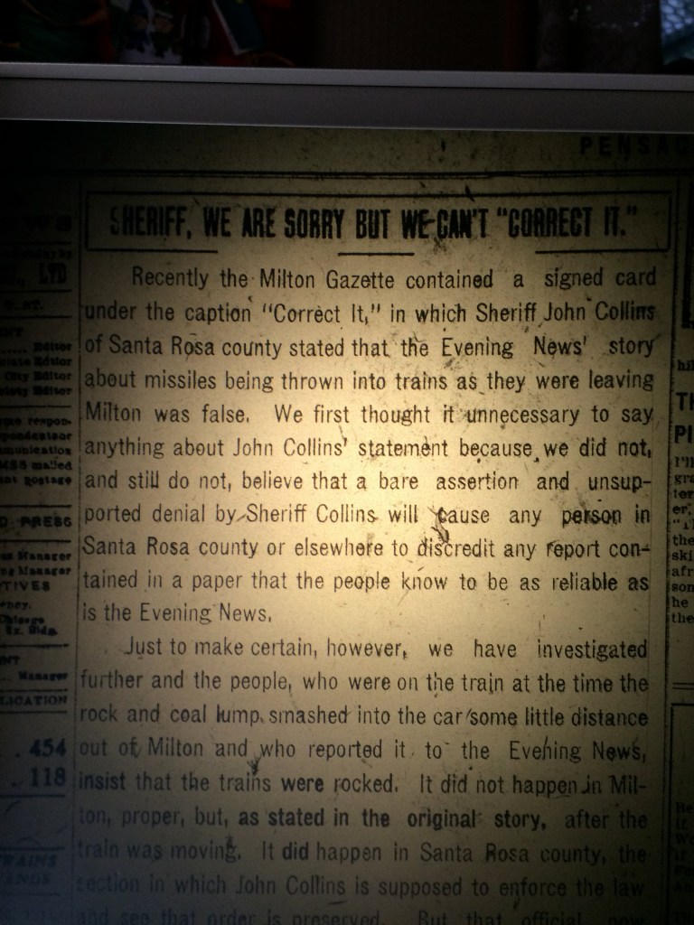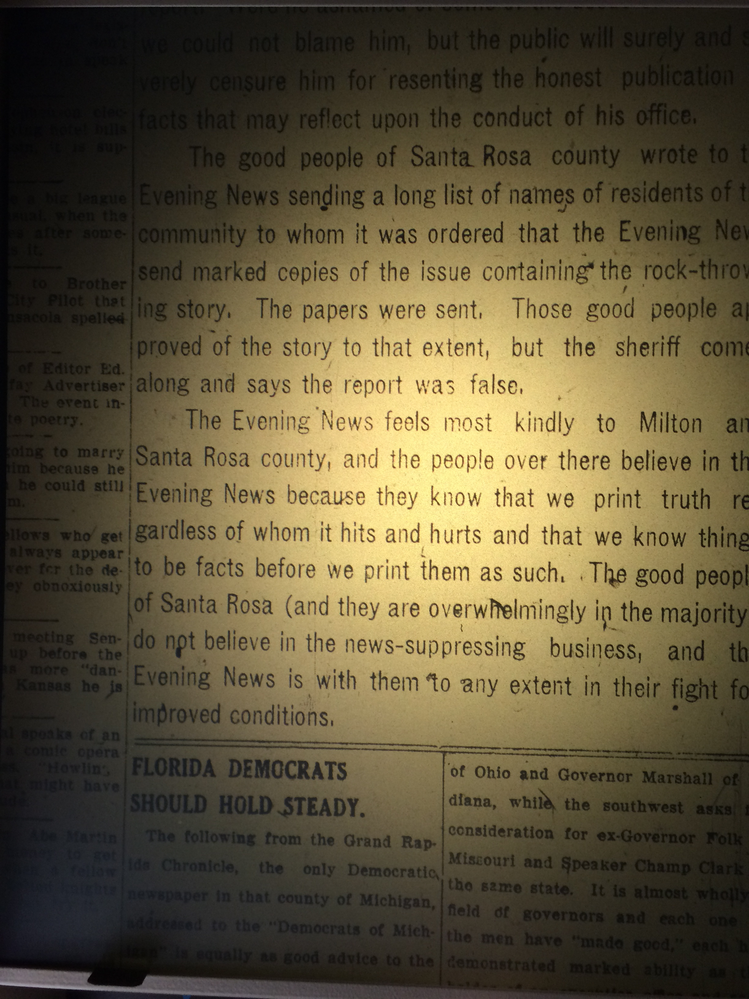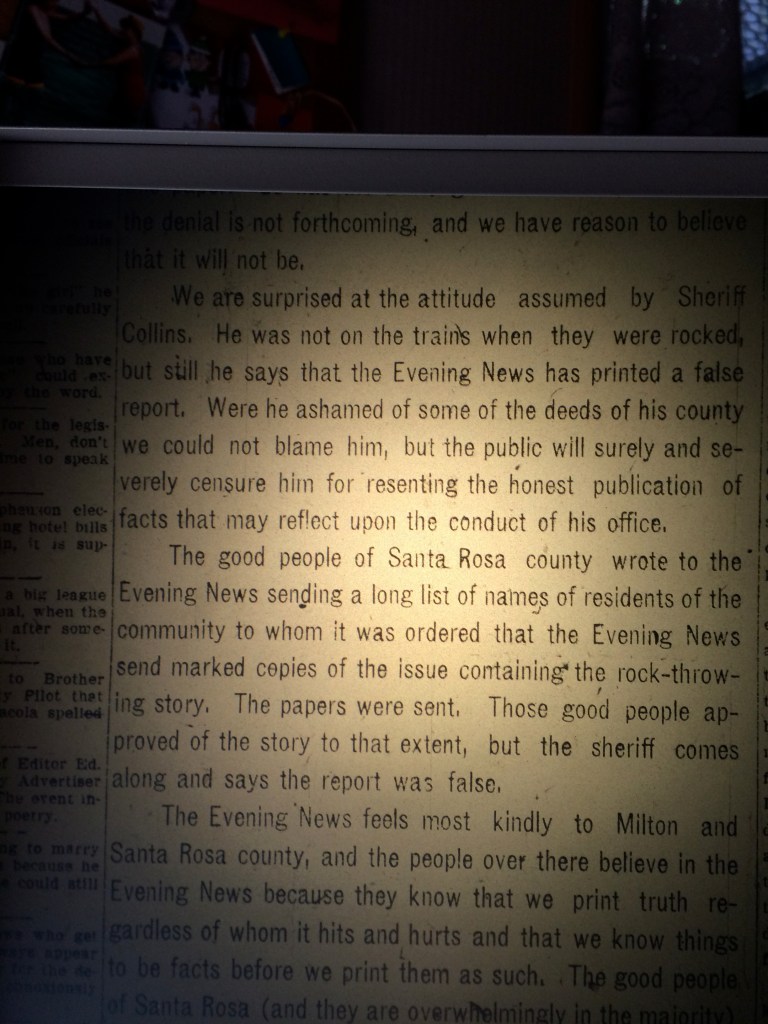 A few days later, the sheriff of Santa Rosa County wanted the editor of the PEN to say that the coverage was a mistake re the attempt on EW’s life — and the editorial says, essentially, hell no.