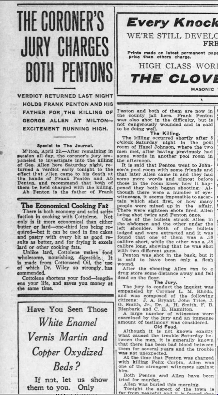 And then: George Allen, one of the witnesses against Penton in the case, was later killed by a member of the Penton family. It sounds complicated because it is — Penton seemed to enjoy causing trouble — and the Panhandle courts went back and forth on his cases for years. Thankfully, I found an article (below) from The Pensacola Journal that summarizes what was going on with the Pentons while this was connected to Emmett.