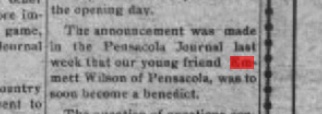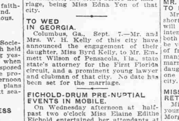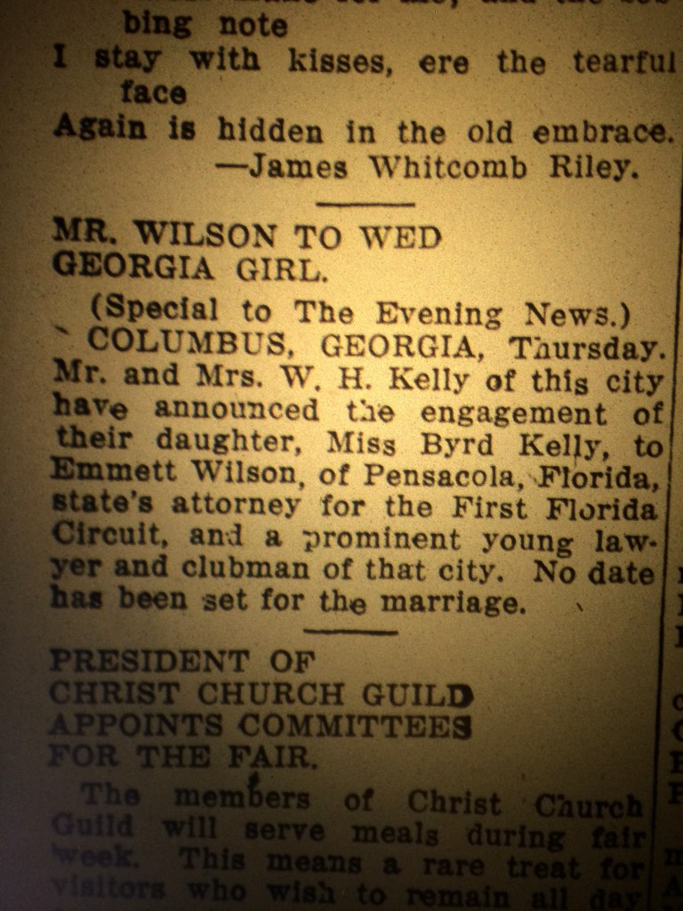 To be honest, at this point in Emmett’s career, he’s also kind-of a nobody in Pensacola society, though he is a known entity I said. “Emmett, a mostly unknown local lawyer has top-billing in the Pensacola paper announcements. Do you really think the bride’s family, who were quite well-to-do in Columbus, Georgia, would have only mentioned Emmett’s qualities and not hers?”