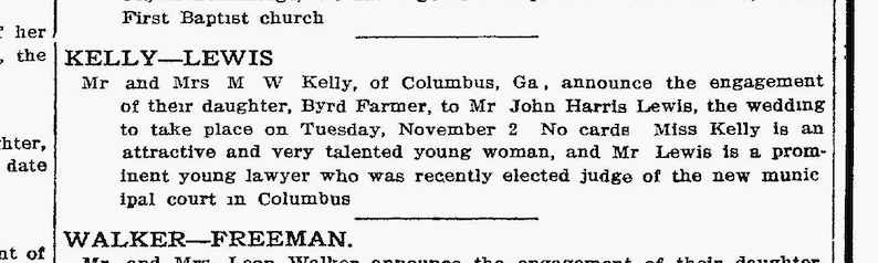 I pulled out hard copies of the Wilson announcements and Byrd Kelly’s actual wedding announcement in the Georgia newspapers, and laid all of the different engagement announcements down side-by-side, comparing them with Nancy watching closely as we went line-by-line.