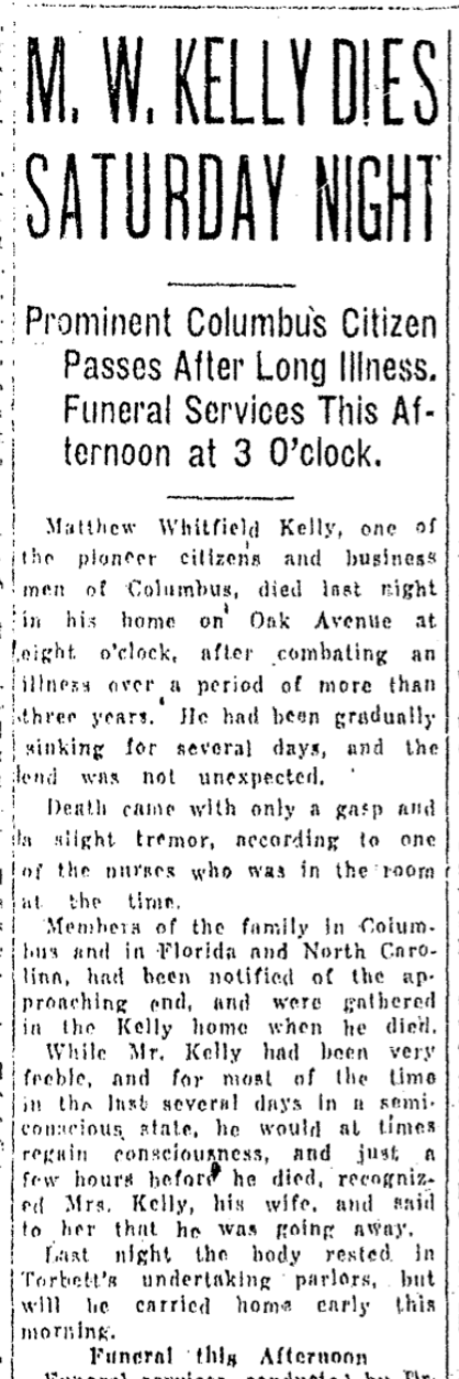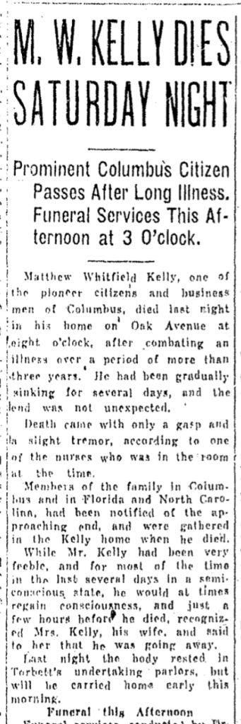 “Look at the name on the clip: W.H. Kelly. Byrd’s father was known locally as “Whit” but his name was Matthew Whitfield Kelly, not W.H. Kelly. There IS a W.H. Kelly family in Columbus, but they were not related to Byrd’s family. That was a bonehead mistake.”