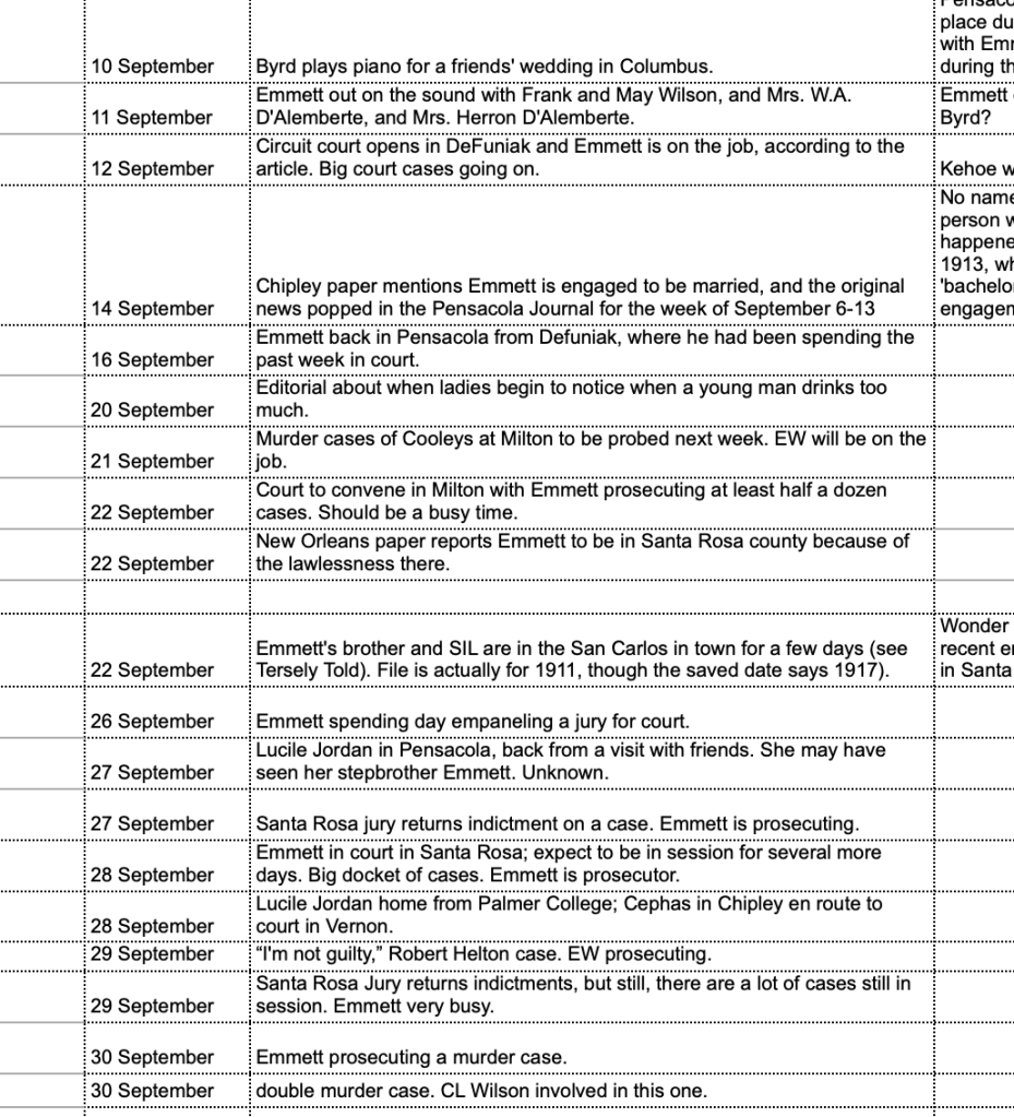 Logistically, the 246-mile trip from Pensacola (or, Santa Rosa County, Florida, where Emmett was in the middle of prosecuting murder cases) in 1911 was time consuming and expensive. Today, a one-way trip is a 4.5 hour drive (depending on traffic). But in 1911, a one-way trip was about 15 hours (mostly by trains traveling an average of 30 miles per hour, with multiple stops, and making a connection at Apalachicola). One could also take the train and then take a steamer up the Chattahoochie which might be a bit faster (10 hours or so), but again, time consuming and expensive for the average person. Because Emmett had family connections with the railroad (older brothers Francis and Meade were well-known conductors on the line he’d have used), the train cost was likely waived. The point is, this was not a trip he took regularly (or, at all).