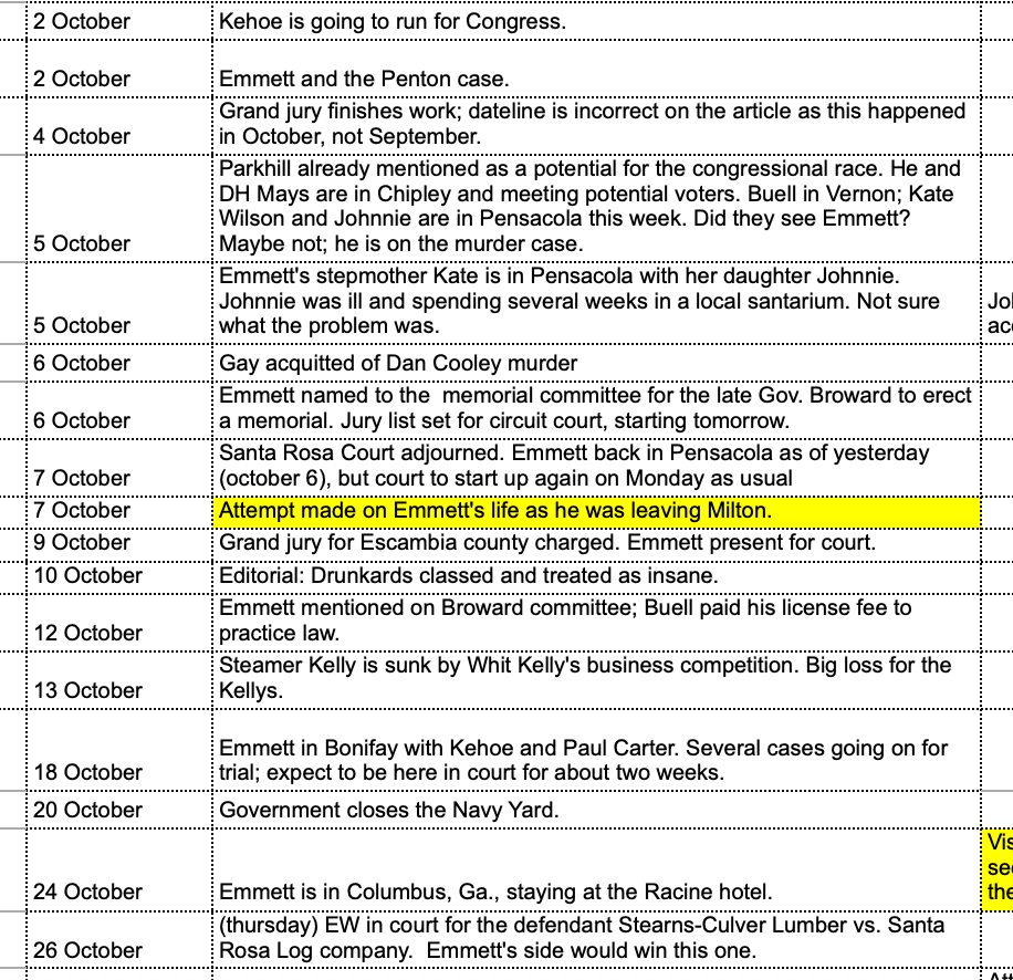 Did you notice that there was an attempt on Emmett’s life on October 7, 1911? No, it wasn’t at the behest of Whit Kelly; it was connected to the Frank Penton murder case and it happened as Emmett and the judge hearing the case were leaving Santa Rosa County for Pensacola after one of the hearings. The Pensacola Evening News said Emmett was ‘fearless’ in the way he handled himself with the hearings, and the attempt on his life.