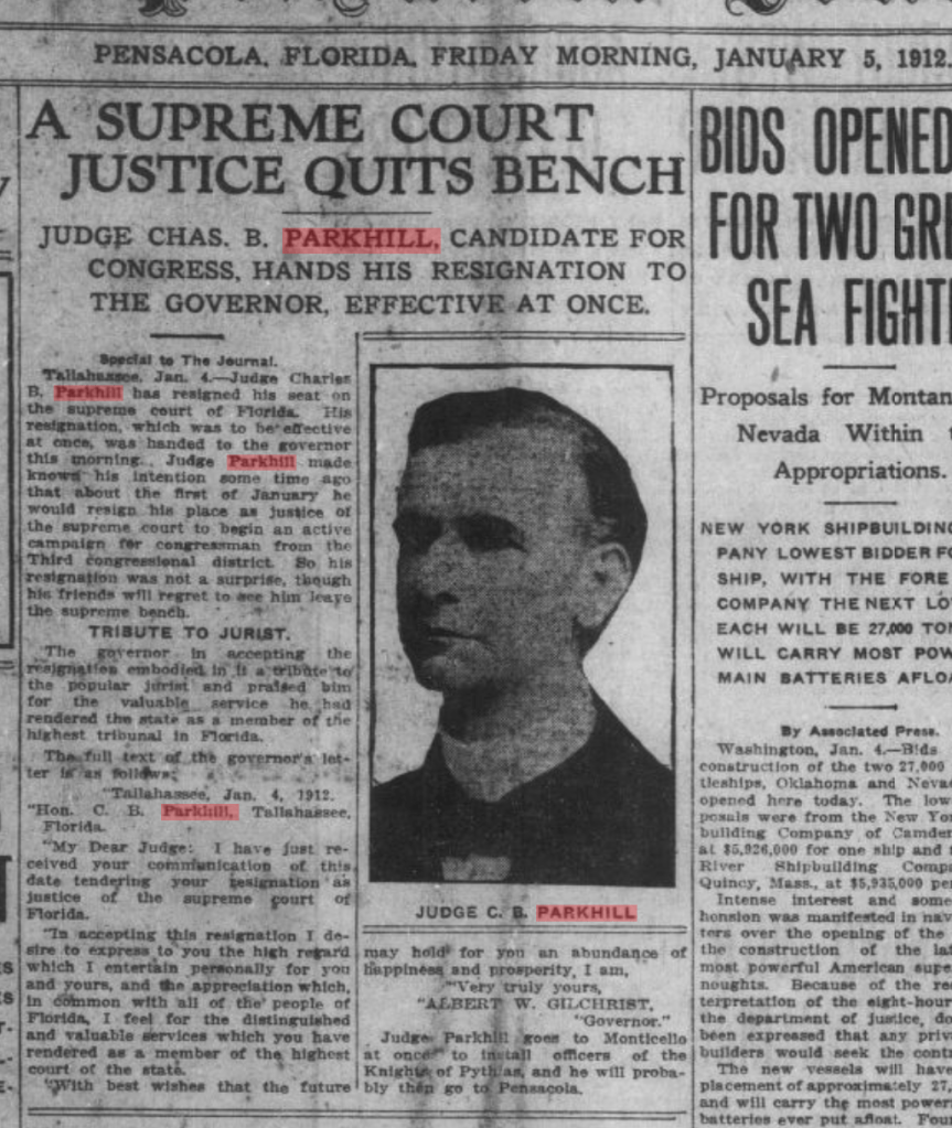 Charles Breckinridge Parkhill, a lifelong resident of Tampa, a member of the Florida Senate and the Florida Supreme Court (and eventually became the Tampa city attorney), was well-known, well-regarded, and well-funded (he had the means to run for office full-time). He was clearly well qualified to run for office, and would represent the state effectively.