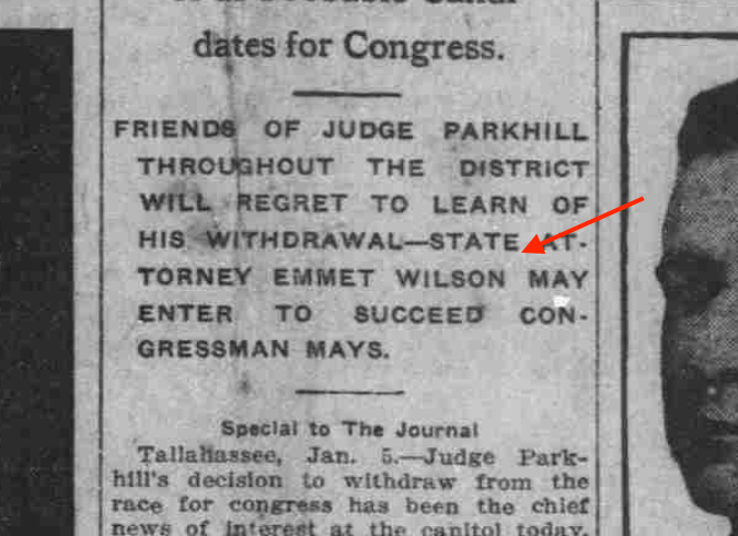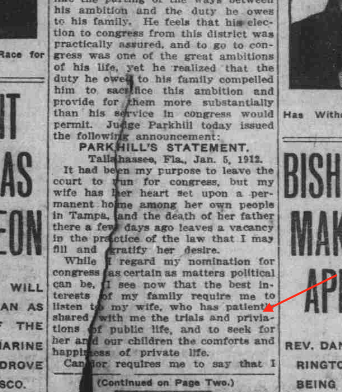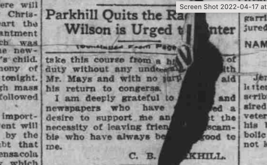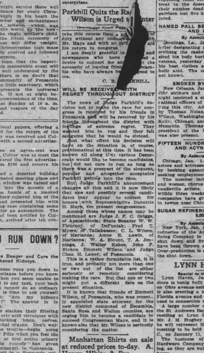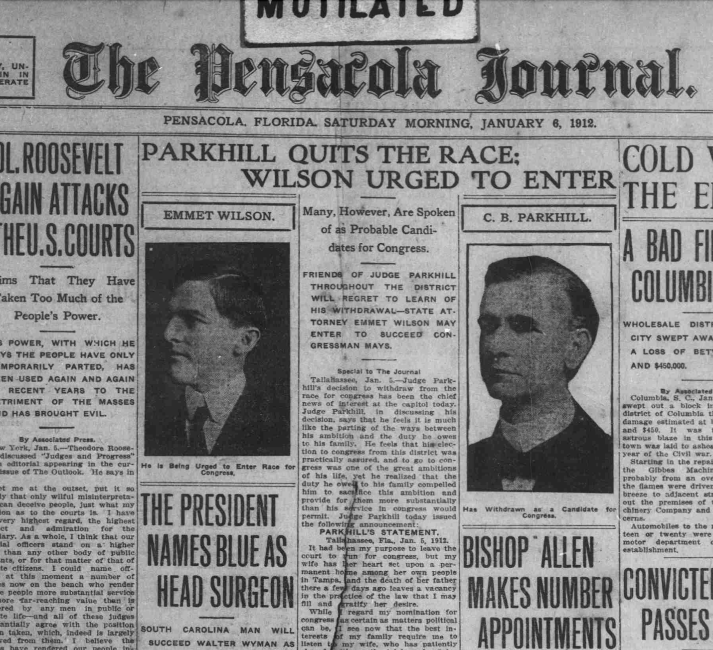 According to the information in The Pensacola Journal, Parkhill issued a written statement to the same paper, dated the same day the article ran announcing his candidacy. Was it a case of misinformation issued from someone in Parkhill’s office? Perhaps; the letter Parkhill wrote to the governor (and printed in its entirety on the front page of The Pensacola Journal the day before) gives no indication that he was resigning to run for national office.