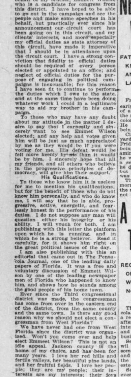 Several days before the primary, Emmett’s brother Cephas, the well-known, politically prominent judge and mayor of Marianna, Florida, was asked to write a letter for The Pensacola Journal in support of Emmett.