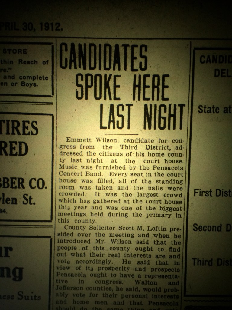 “Emmett Wilson, candidate for congress from the third district, addressed the citizens of his home county last night [Monday, April 29] at the court house. Music was furnished by the Pensacola Concert Band. Every seat in the court house was filled, all of the standing room was taken and the halls were crowded. It was the largest crowd which has gathered at the court house this year and was one of the biggest meetings held during the primary in this county.
