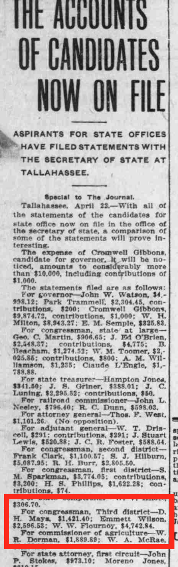 “After Mr. Wilson’s address Captain J Ed O’Brien Pensacola candidate at large was introduced…WA McRae, Candidate for commissioner for agriculcture spoke in his own behalf.