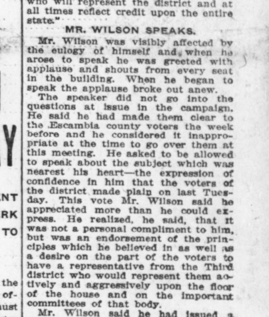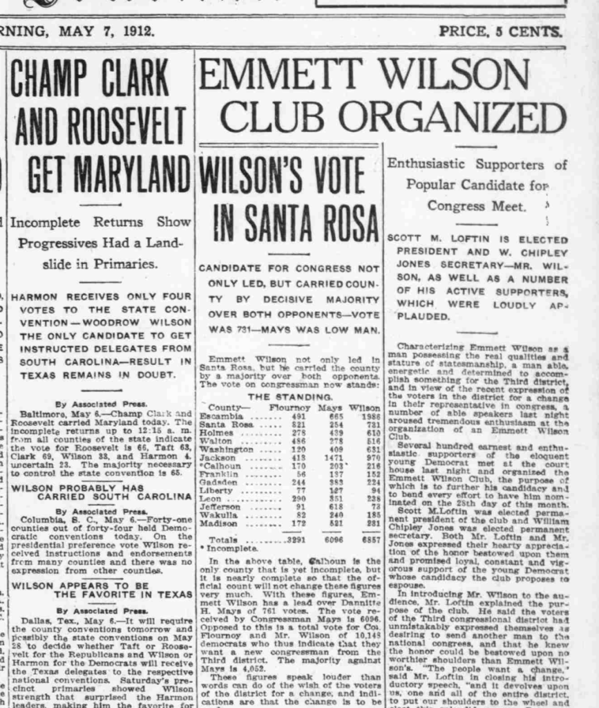 The second primary coverage also boosted the public image of Emmett as a young, fierce, energetic campaigner worked well for him, compared to the stodgy, business-as-usual image of Dannite Mays. Mays gave off the feeling low energy. Emmett was the opposite, and it fired people (and the press) up. On May 7, Emmett’s friends launched the “Emmett Wilson Club,” a state-wide effort with lots of grassroots support to promote his campaign. “The people want a change,” said Scott Loftin, a prominent Pensacolian, close friend of Emmett, and the president of the Emmett Wilson Club, “and it devolves upon us one and all,” to elect Emmett to U.S. Congress.