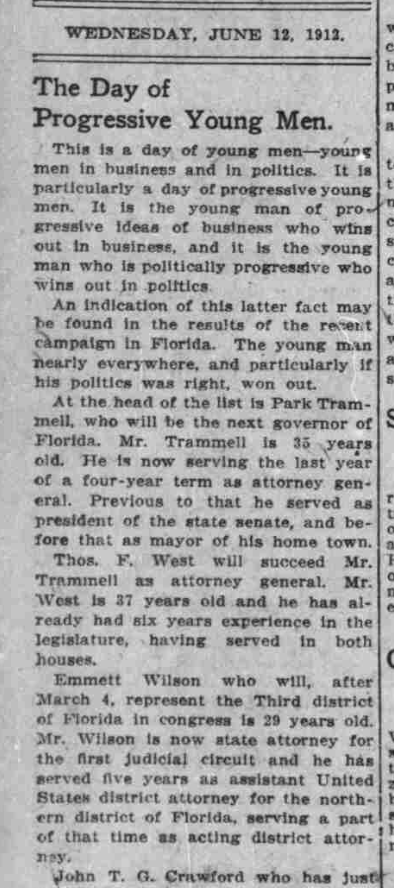 Emmett still had to win the General Election in November; odds were greatly in his favor, as Florida was a heavily Democratic state in 1912. Still, Emmett’s public relations machine (unofficially headed by Mayes, naturally) regularly published editorials praising Emmett’s youth, potential, clean-cut and energetic personal, and (interestingly) his appeal to women. During the summer of 1912, Mayes published at least some positive mention of Emmett in his paper, even if Emmett wasn’t doing anything particularly newsworthy that day.