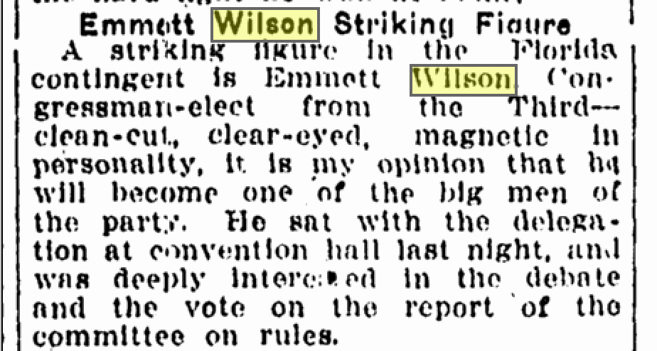 Mayes wasted no time indoctrinating Emmett into his grand plans to become an influencer to the next President of the U.S. Mayes, cunningly, saw the next president as Woodrow Wilson. In fact, Mayes insisted that Emmett be selected as an alternative delegate from Florida to attend the Democratic National Convention, which would be held in Baltimore, Maryland. (More on that event in an upcoming chapter.)