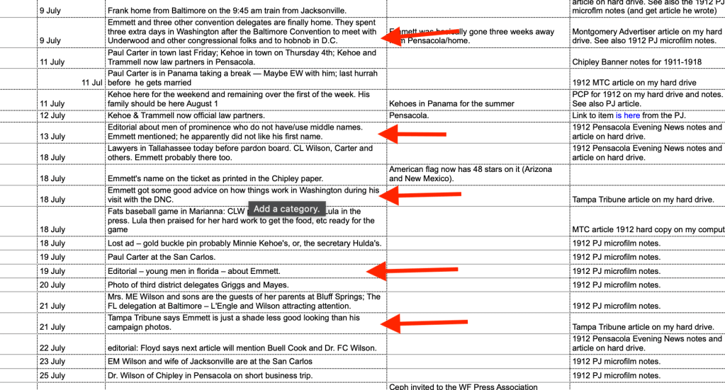 A screenshot of one of my data tables on Emmett’s media coverage from June-July, 1912, featuring a summary of the article, the location of the clip and the media source. While Emmett was in Frank Mayes’ good graces, this was typical of Emmett’s media coverage, the goal of which was to keep Emmett and/or his well connected siblings’ names in current news articles. Once Emmett fell from Mayes’ favor (1915 onward), his presence in local media was almost nonexistent.