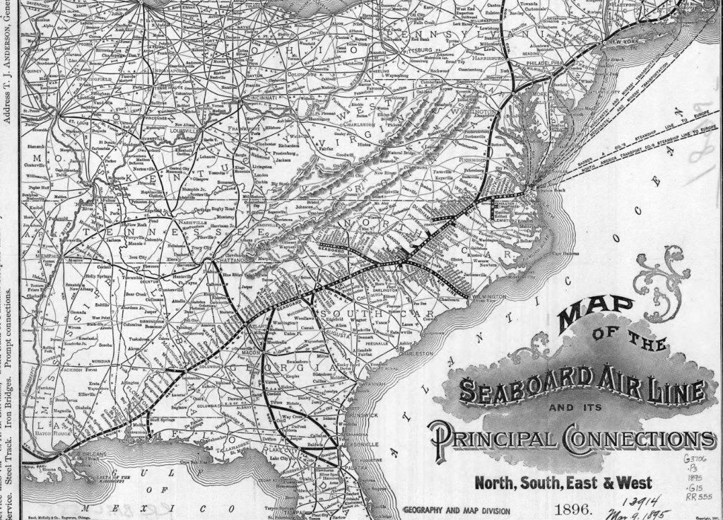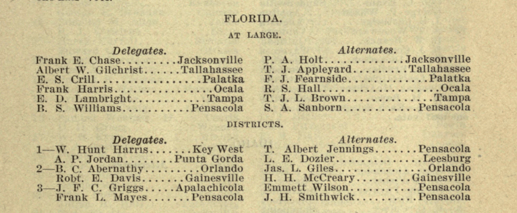 If you take a look at the map of the railroads serving Florida and the Atlantic states, you’ll notice there are a LOT of stops along the way. I’m not certain if his train stopped at every one of the stations along the route, but this was, minimally, an 18-hour train trip. The map below shows a rather daunting number of stops. Emmett, Williams, and West probably (hopefully) had sleeper accommodations, in addition to the convention reading material to busy themselves during the trip.