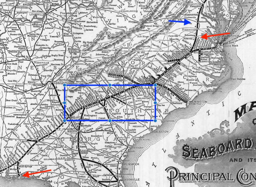 Emmett, Williams and West took the L&N Railroad originating in Pensacola, then to Atlanta; once there, they switched to the Seaboard Air Line Railroad. Emmett remained on the SAL train until Petersburg.