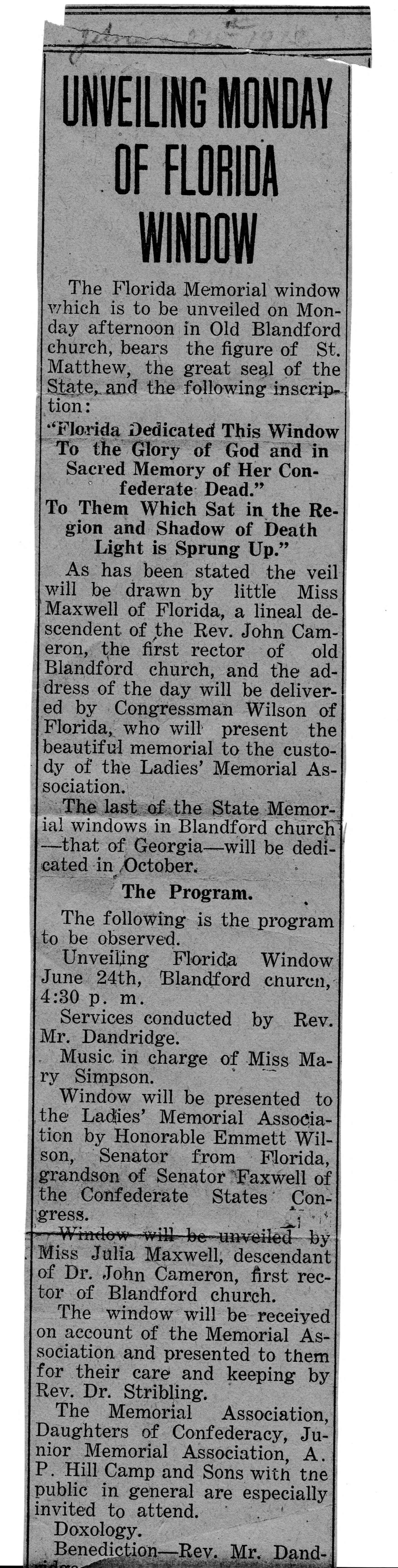 The Florida window unveiling took place at 4:30 pm on Monday, June 24, 1912. There’s a notation that Emmett gave a beautiful and moving speech, but unfortunately, my sources at the Old Blandford Church archive told me there is neither a copy of that speech in their archives, nor notes of what was said in the documents related to the Florida window unveiling. All we have (to date) are secondary reports that the speech was received positively.