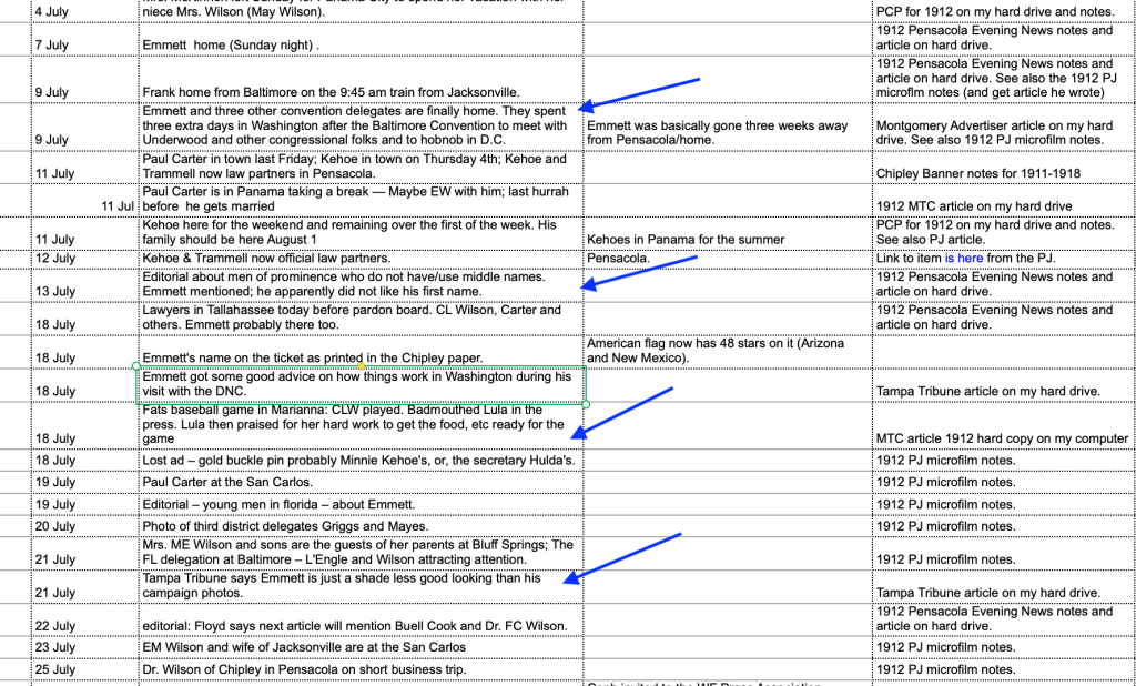 The remainder of the table shows some general information about his family and friends’ comings and goings; Emmett’s best friend Paul Carter comes to Pensacola for social/business activities, Emmett’s father comes into town for a visit.