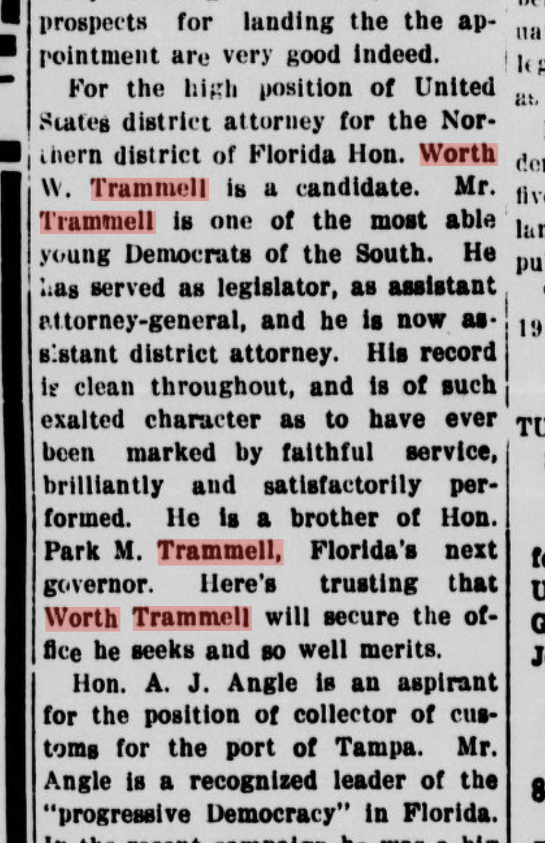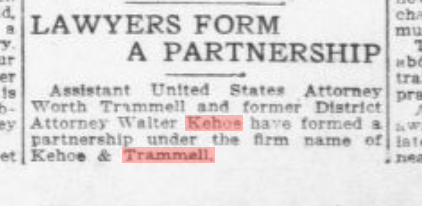 July 5 and July 12, 1912: Emmett’s law partnership with Kehoe is dissolved, and Walter Kehoe establishes a new partnership with Worth Trammell. Information about the change in partnership ran on both dates, July 5 and July 12 in the local newspapers. Worth Trammell was a friend of both Emmett and Walter Kehoe; he was the brother of Park Trammell, who was, at present, Attorney General of Florida, and who was running for was Governor of Florida in 1912.