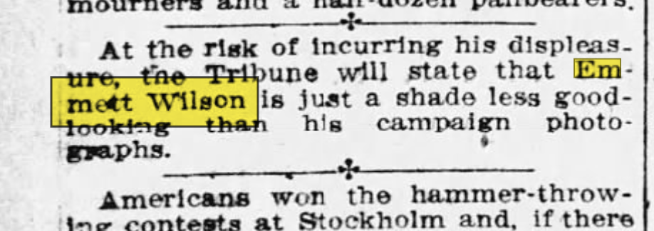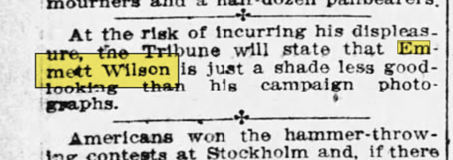 It’s a random and superficial article about him that isn’t of much substance; for instance, about men of prominence who don’t have/use middle names. So what? (Emmett was using his middle name, btw; he never mentioned his first name, which was Archibald, because he didn’t like it.) A little further down the chart, The Tampa Tribune noted that Emmett’s campaign photo looks better than he does in person.