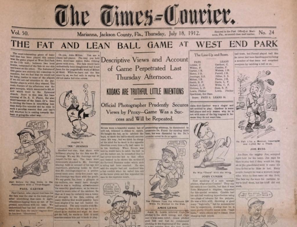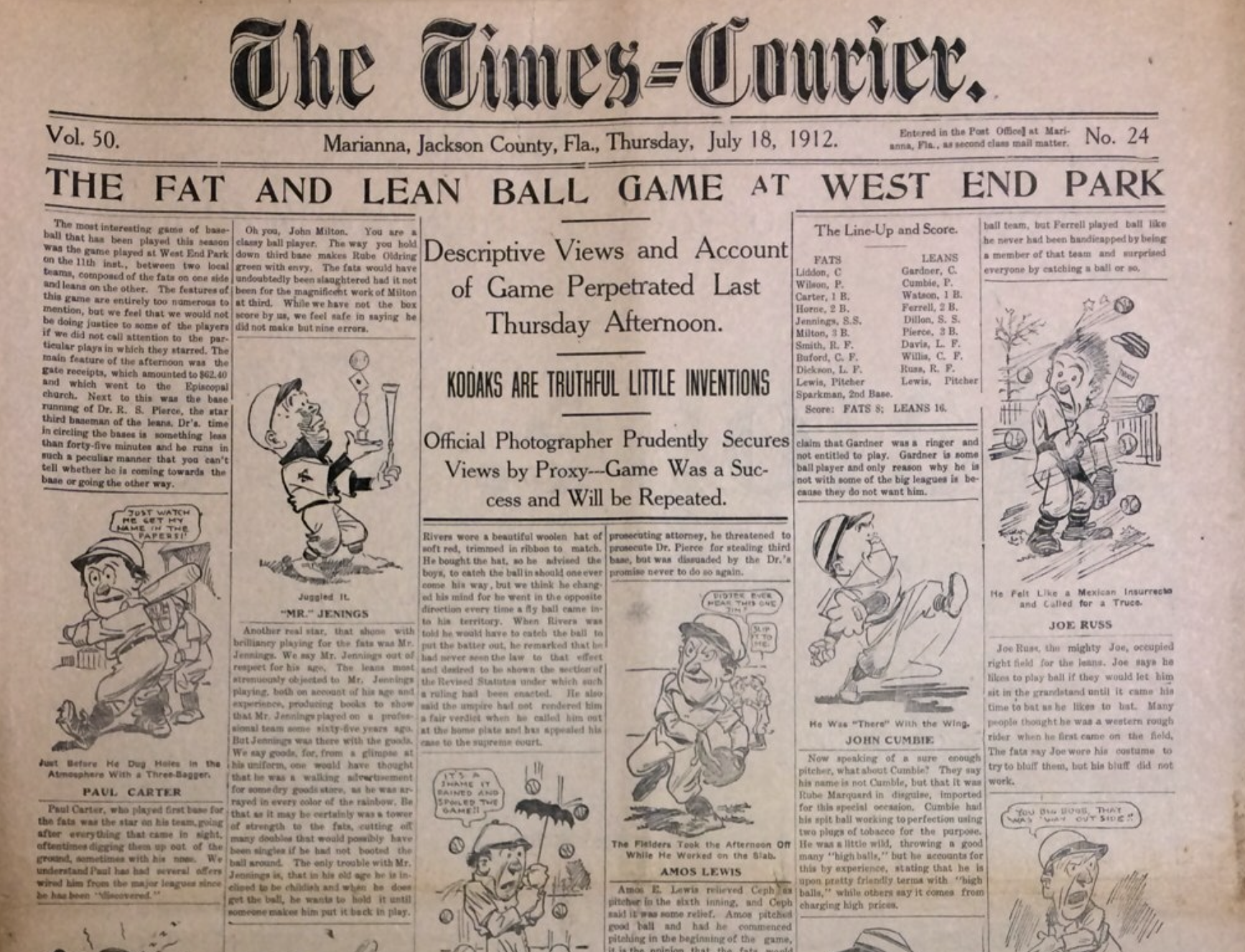 But one of the more interesting items is on July 18, a baseball game among local and state political heavyweights, the “Fats” versus the “Leans”, which was played in Marianna. I came across the writeup by accident while I was working in archives at the University of West Florida in Pensacola. The writeup was in the Marianna Times-Courier, has not been digitized, and sadly, is in fragile condition, but the article is entirely amusing and includes wonderful humorous sketches of several of Emmett’s friends and colleagues: