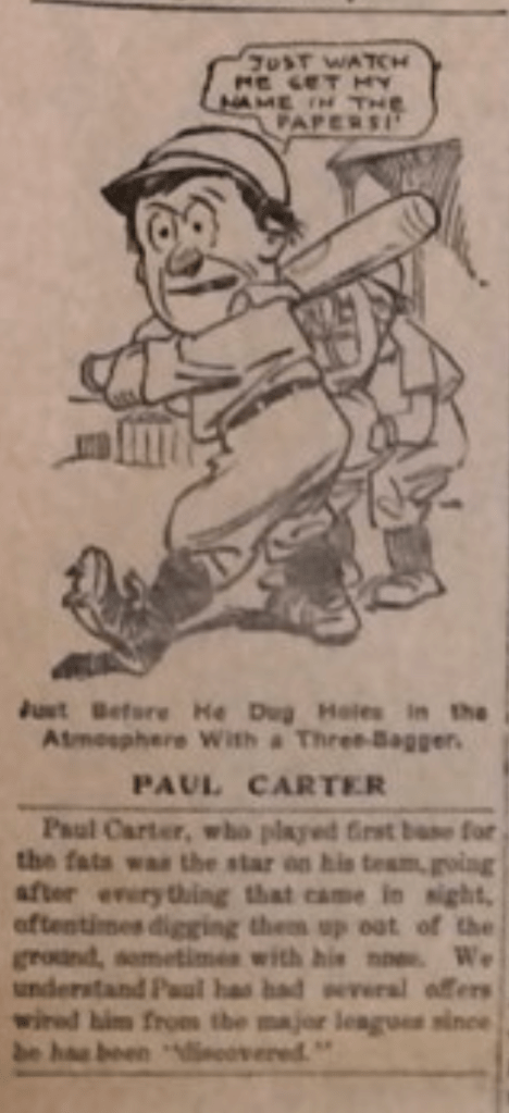 On the upper left of the page is Emmett’s best friend and fellow baseball player (when they both lived in Chipley during college days), Paul H. Carter. The article says Paul was the star of the game, played first base for the “Fats” team, and was ‘going after every thing that came in sight, oftentimes digging them up out of the ground, sometimes with his nose’ and that he had several offers from professional teams based on his playing ability.