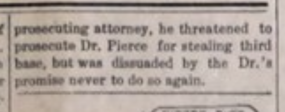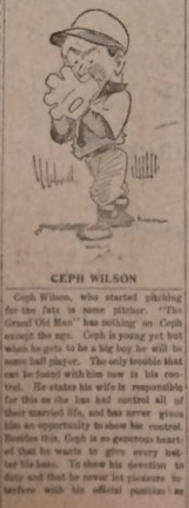 “Ceph Wilson, who started pitching for the Fats is some pitcher. “The Grand Old Man” has nothing on Ceph except the age. Ceph is young yet but when he gets to be a big boy he will be some ball player. The only trouble that can be found with him now is his control. He states his wife is responsible for this as she has had control all of their married life, and has never given him an opportunity to show his control. Besides this, Ceph is so generous hearted that he wants to give every batter his base. To show his devotion to duty and that he never let pleasure interfere with his official position as prosecuting attorney, he threatened to prosecute Dr. Pierce for stealing third base, but was dissuaded by the Dr.’s promise never to do so again.”